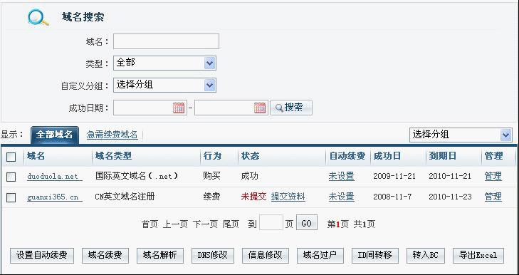 1.請您使用萬網(wǎng)會員ID和會員ID密碼登陸萬網(wǎng)會員區(qū),點擊頁面左側(cè)“產(chǎn)品管理”中“域名管理”,此時頁面右側(cè)出現(xiàn)您ID下購買的域名,如圖所示: