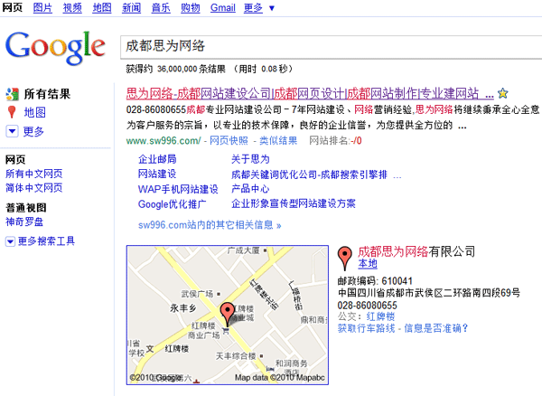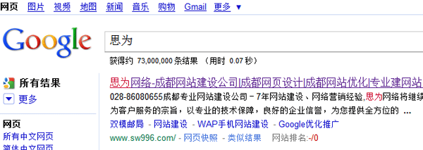 搜索"成都思為網(wǎng)絡(luò)"時,顯示GOOGLE站內(nèi)鏈接如下: