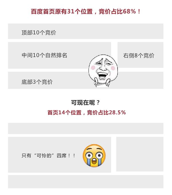 距上次百度刷屏后,昨天互聯(lián)網(wǎng)廣告圈里又出現(xiàn)百度競價(jià)的新聞,首頁競價(jià)位置縮減到4個(gè),然后就是各種營銷公司更加瘋狂的推動(dòng)百度產(chǎn)品,邏輯很吊詭,這更是奇缺資源了,物以稀為貴嘛。